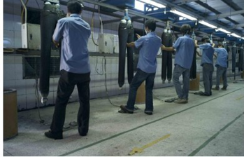 用這種新技術研發出的投加工藝分為干法濕法兩種:濕法工藝是將臭氧溶解在水中形成臭氧溶液,然后用噴霧器將溶液噴在牛仔服需要脫色的部位。干法工藝需先用水潤濕要加工的面料,利用不同的酸堿度pH值來控制脫色率,再把臭氧直接噴在脫色部位使其脫色。這種工藝效率高,時間短,可滿足不同脫色圖案的加工需要,成品手感柔軟舒適。