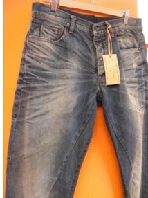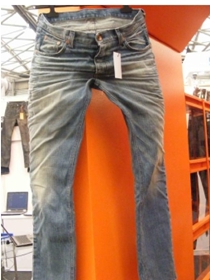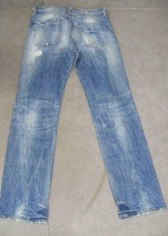 a) 在洗水前,通過使用砂輪滾動摩擦而使布面染料褪色,手擦的地方通常是脾位和臀位,人為的機械褪色,讓牛褲在洗水后顯得自然地懷舊和泛白