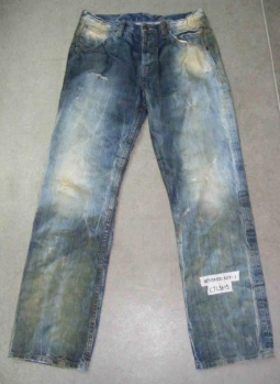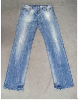 將衣物在洗水前,人為地將褲腳,褲頭等一些特定部位用銳器刮爛,從而制成洗后的破爛懷舊效果